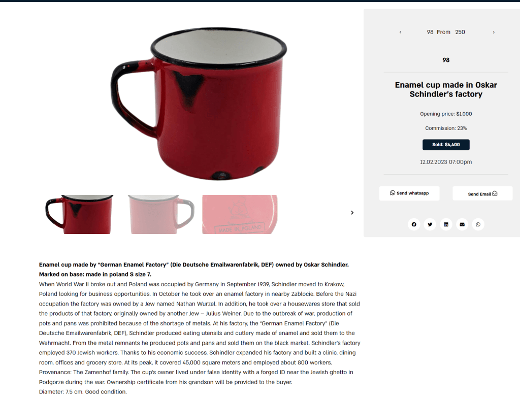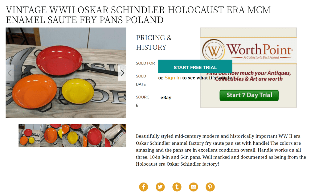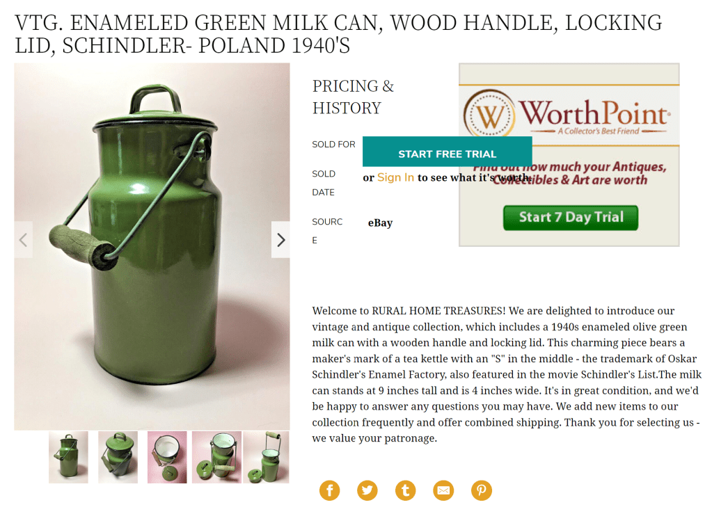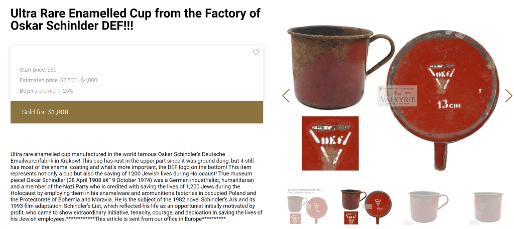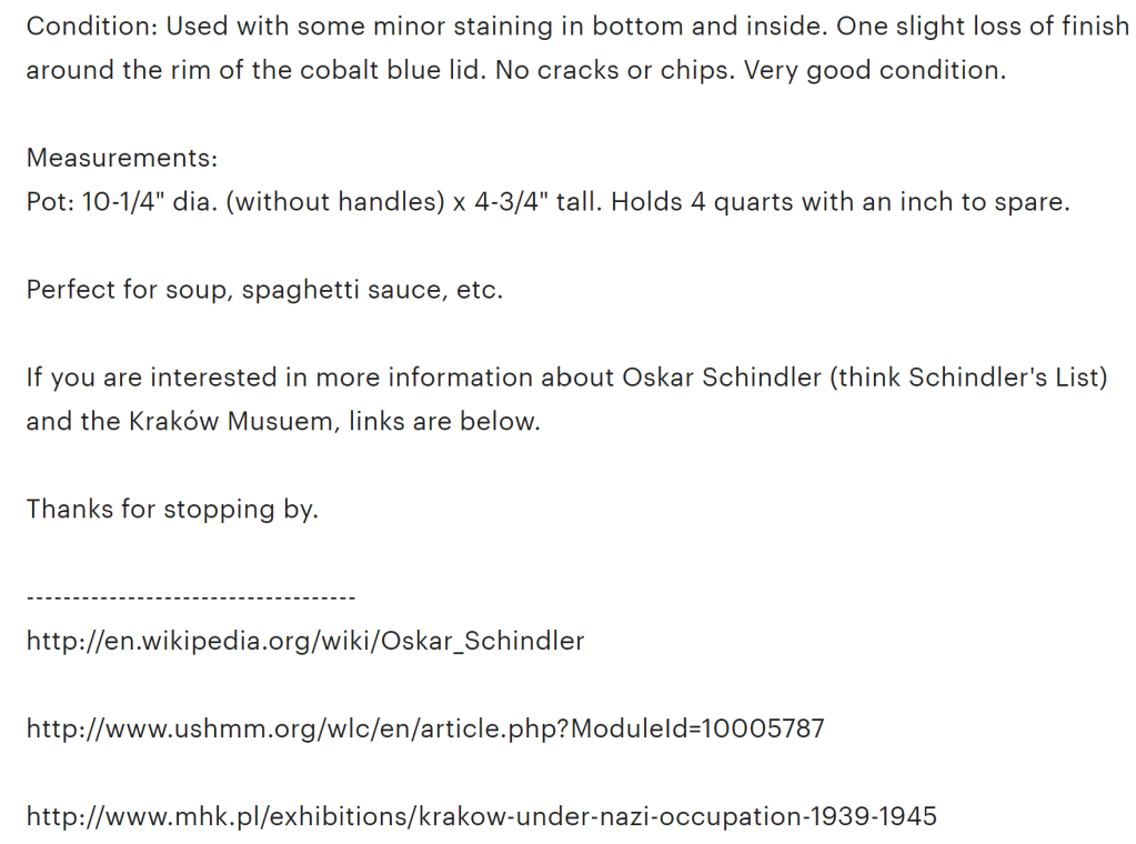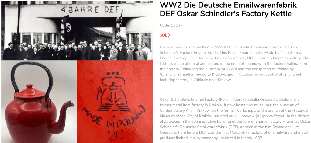 Whether a seller likes it or not, the listings they create become records and are used as a source of information. Not performing due diligence and making false claims can lead to all sorts of implications. In the case of these inaccurate Oskar Schindler listings, the claim of enamelware made during that time and place, in a factory run by a Nazi, while featuring a MADE IN POLAND stamp, creates an erasure of the violent Germanization period where Poles were robbed of their nation and national identity. It’s a way of creating misinformation and given the amount of conspiracy theories and Holocaust denial that’s taking place today, there’s a very real responsibility when dealing with items from the Holocaust/WWII time period.