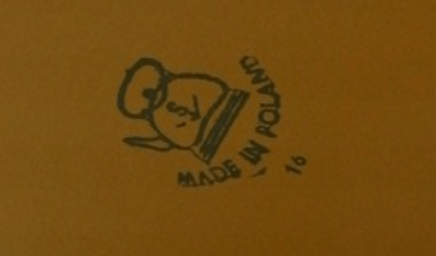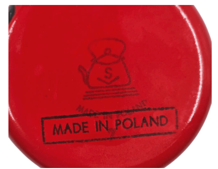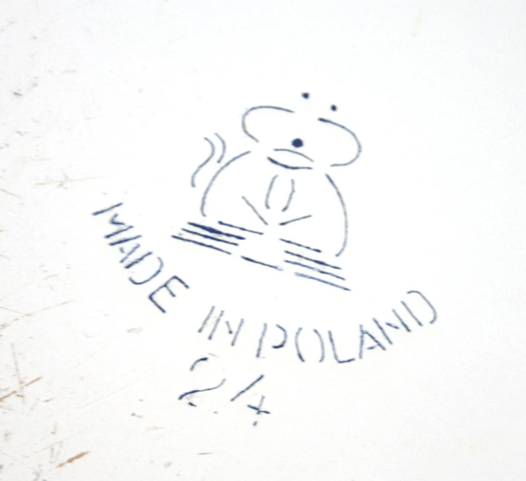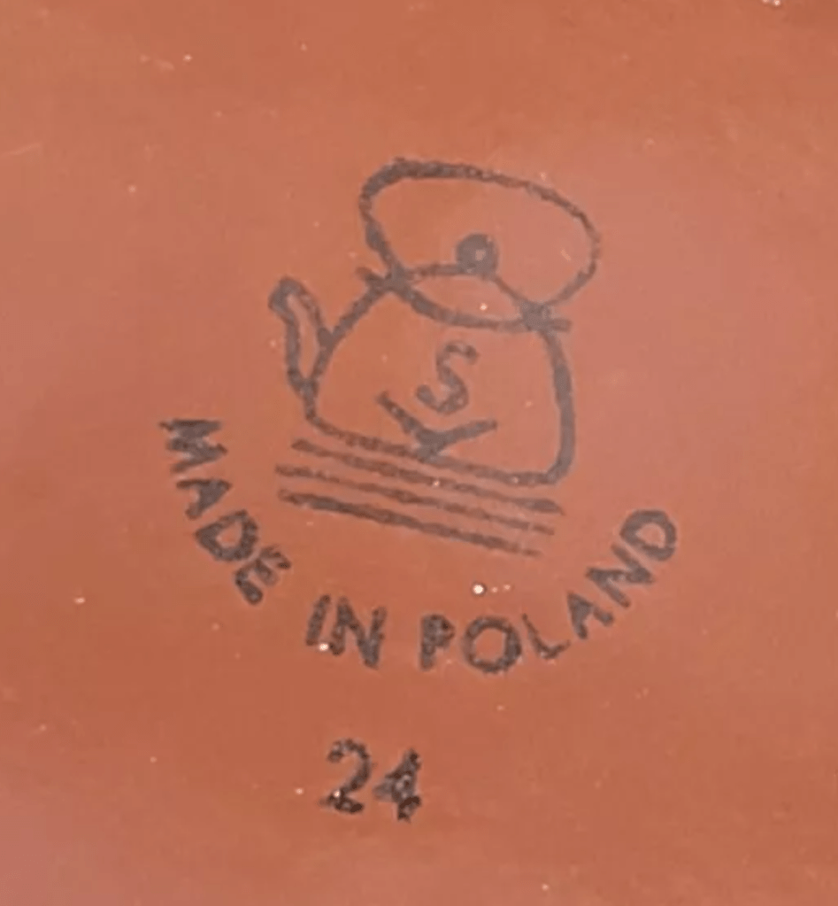 This listing comes from Etsy12. The seller lists their pot as made in Schindler’s factory and they think it’s just perfect for cooking soup or spaghetti in. For the buyer wanting to learn more about Oskar Schindler and his factory, the seller has provided links they undoubtedly did not read. The maker’s mark on this one is slightly different from the ones we’ve seen. It’s a tea kettle, but rather than an “S”, there’s an “O” inside. Again, another “MADE IN POLAND” stamp.