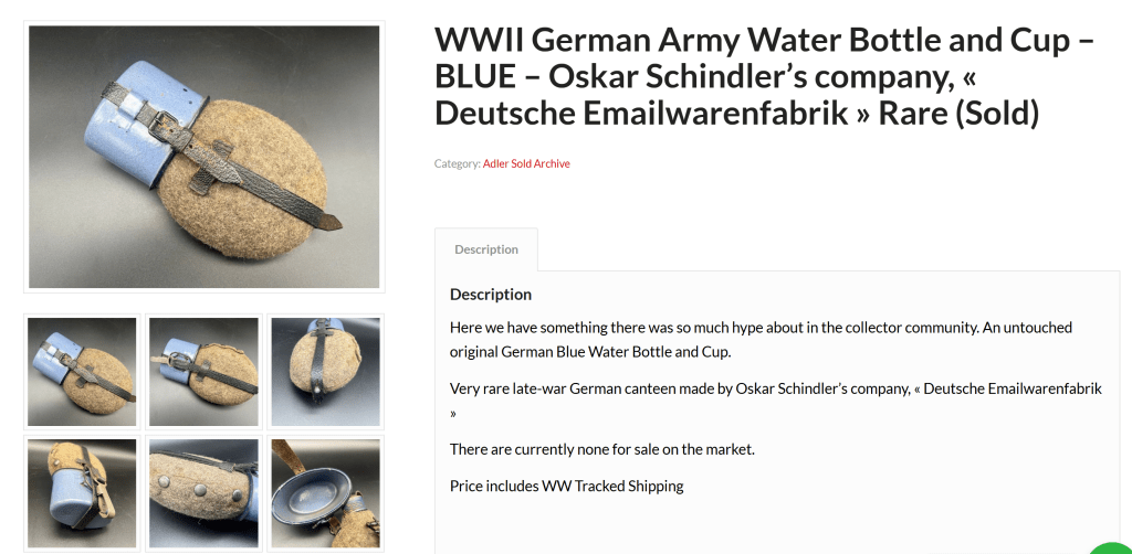 Here’s an unmarked water bottle34 and cup from Schindler’s factory, listed by Adler Militaria. Again, it looks like it fits the time frame and would be something used by the Wehrmacht.