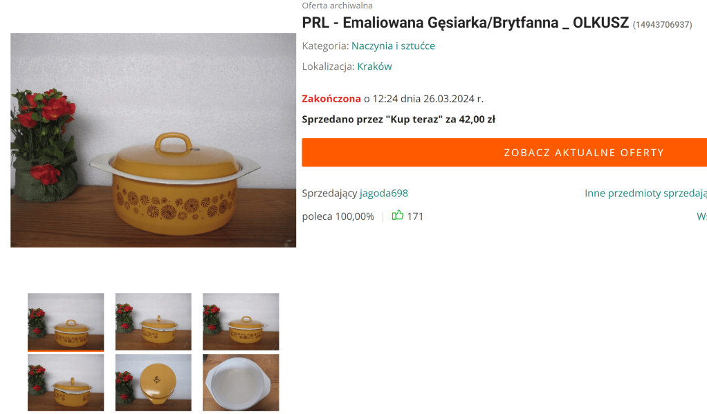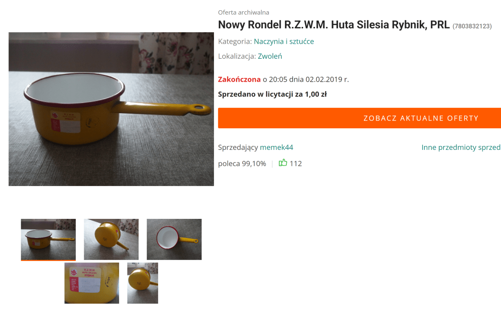 One thing I noticed when I was looking at the Huta Silesia listings on the Allegro Archive was that many used “PRL” in the title. PRL stands for Polska Rzeczpospolita Ludowa, or Polish People’s Republic. It refers to a time period, 1952–1989, when Poland was under communist rule. I ran a search using “emaliowany” (an adjective, which means enameled) and “PRL” then looked for any listings that looked like the company started with an “O.”