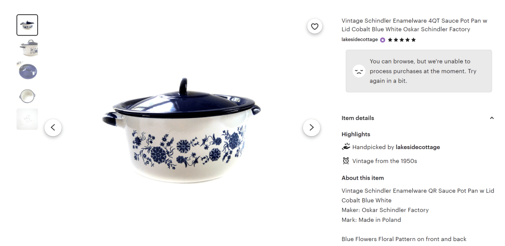 Ultimately, what I found unsettling was the casualness of the listings from sellers who genuinely thought their enamelware piece was manufactured in Oskar Schindler’s factory during the Holocaust. It’s troubling these sellers didn’t recognize the historical value, as well as the emotional significance, these items carry. These were objects made by forced Jewish labor during one of humanity’s darkest times; the idea of cooking and serving soup from one of the pots is absolutely ghastly. This is enamelware that should be preserved, not sold as cookware for everyday use.