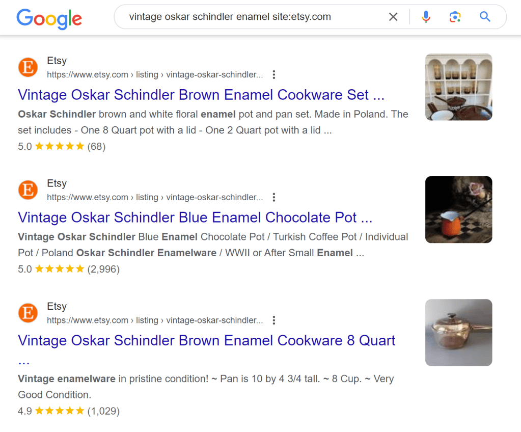 Etsy won’t allow you to search sold items, but running a Google search of “Vintage Oskar Schindler Enamel site:etsy.com”9 will bring up past listings, and there are quite a few.