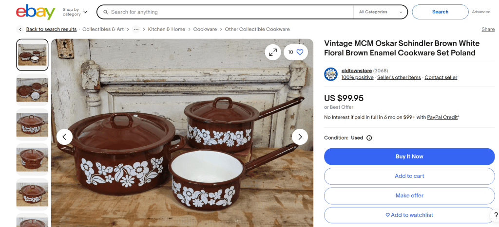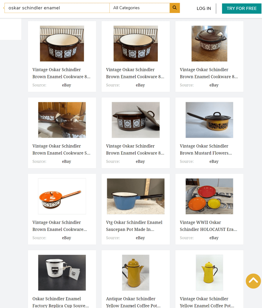 At first, I thought the seller may be trying to get more views to their listing by plopping on Schindler’s name, essentially manipulating the search results, a frowned upon but often used tactic in online selling. But Schindler is an odd choice because this item was described as something you could still cook with today, whereas someone explicitly searching for Schindler enamelware most likely would be looking for it as a collector’s item. My curiosity kicked in and I started searching for other Oskar Schindler enamelware pieces.