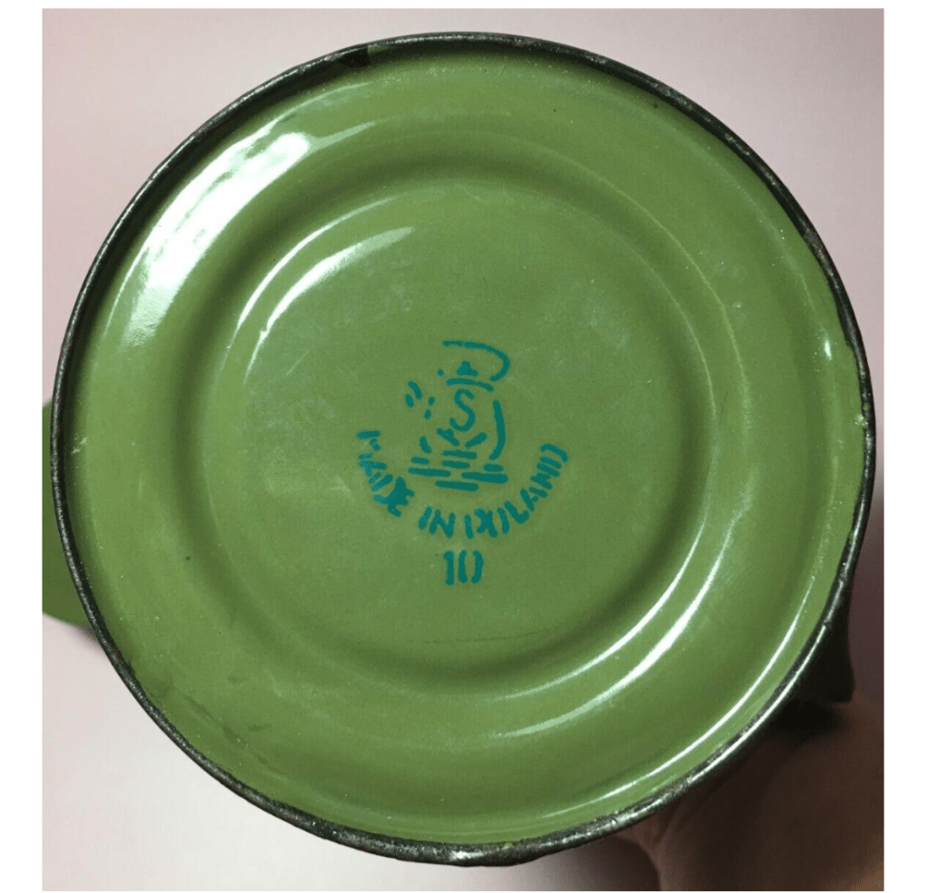 This listing10 comes from Rural Home Treasures and is titled “Vtg. Enameled Green Milk Can, Wood Handle, Locking Lid, Schindler-Poland 1940’s.” They confidently assert that this “charming” piece bears the trademark of Oskar Schindler’s Enamel Factory, a maker’s mark of a tea kettle with an “S” inside. There is a “MADE IN POLAND” stamp.